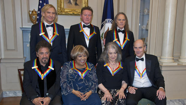 WASHINGTON, DC – DECEMBER 03: The five recipients of the 39th Annual Kennedy Center Honors pose for a group photo following a dinner hosted by United States Secretary of State John F. Kerry in their honor at the U.S. Department of State in Washington, D.C. on Saturday, December 3, 2016. The 2016 honorees are: Argentine pianist Martha Argerich; rock band the Eagles; screen and stage actor Al Pacino; gospel and blues singer Mavis Staples; and musician James Taylor. From left to right back row: Joe Walsh, Don Henley, and Timothy B. Schmidt of the rock band “The Eagles.” Front row, left to right: Al Pacino, Mavis Staples, Martha Argerich, and James Taylor.