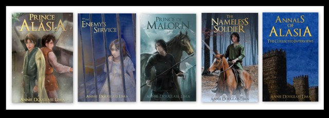 ADL: There are five main books in the series so far, but each of them can stand on its own. Each of the first four books deals with events surrounding the same major political incident: the invasion of the kingdom of Alasia by the neighboring kingdom of Malorn. Prince of Alasia begins on the night of the Invasion and describes what happens to twelve-year-old Prince Jaymin after he is forced to flee for his life. In the Enemy’s Service features a girl as the protagonist and tells the story of those who were not able to escape from the Alasian palace when the enemy invaded. Prince of Malorn begins several months earlier and focuses on the Malornian perspective of the events leading up to the Invasion. The Nameless Soldier shows how a young Alasian soldier lives through the Invasion but then has to survive and make a name for himself in enemy-occupied Alasia. In each of the books, main characters from the others make brief appearances and interact with each other at the point where the timeframes and settings overlap.