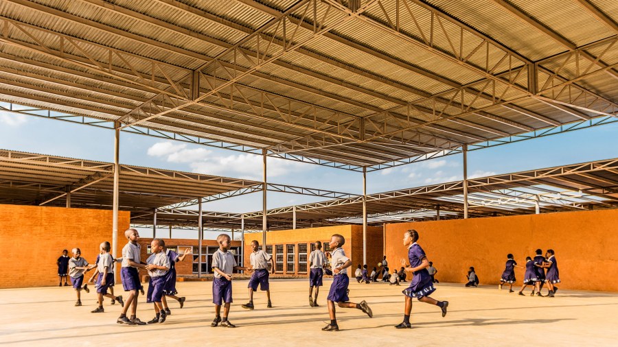 Students play in the Mwabwindo School’s covered courtyard.Photo: Chosa Mweemba / Courtesy of Selldorf Architects