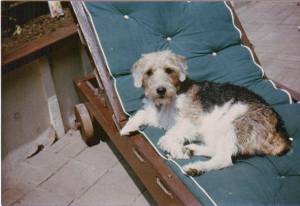 Dear Millie. I think she was my all-time favorite dog. There was something about her—so loyal and so loving. She was sort of an “underdog” type of dog. With her mish-mash of parts—wide stomach, skinny legs, and short tail that ended in a stinger of hair—she was only beautiful in her owners’ eyes. People thought she was older than her years, and often thought she was a “he.” Millie was a good sport, as you see her here in a Halloween costume. Although I’ll admit she doesn’t look too thrilled!